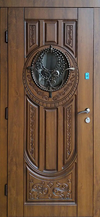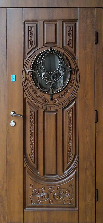 Владельцы коттеджей ценят входные конструкции, которые одинаково подчеркивают статус и защищают от любых внешних факторов. Здесь удачно сочетаются прочный металл и массив дуба, придающий поверхности солидность и благородство. Натуральное дерево сохраняет цвет и текстуру долгие годы, устойчиво к механическим повреждениям и перепадам температуры. Внутри конструкции скрыт стальной каркас толщиной 1,5 мм с ребрами жесткости и противосъёмными блокираторами, что делает полотно практически неприступным. Особое преимущество — терморазрыв коробки и полотна, благодаря которому дверь не промерзает даже в сильные морозы и сохраняет тепло в доме. Именно на этом контрасте надежности и эстетики выделяется железная дверь со стеклом и ковкой №21, украшенная изящными декоративными элементами. Три контура магнитного уплотнения обеспечивают герметичность, а система замков Kale Kilit повышает уровень безопасности, при этом конструкция допускает установку современных умных решений и дополнительных декоративных опций. Железная дверь со стеклом и ковкой №21 от производителя: быстрое изготовление и монтаж в Нахабино, индивидуальные размеры, широкий выбор материалов и фурнитуры, официальная гарантия до 10 лет.