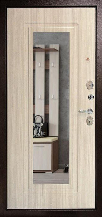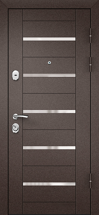 Прочный стальной каркас, лист металла толщиной 2 мм и система блокираторов делают эту модель надежным барьером для квартиры, офиса или частного дома. Внешняя поверхность покрыта молотковым напылением, устойчивым к механическим повреждениям и перепадам температуры, благодаря чему дверь сохраняет аккуратный вид долгие годы. Внутренняя накладка МДФ добавляет уюта и гармонично сочетается с интерьером прихожей. Зеркало на полотне выполняет не только декоративную функцию, но и делает пространство визуально шире. Зеленая входная дверь в квартиру №2 комплектуется двумя замками российских производителей — сувальдным Просам и цилиндровым Мосрентген, каждый из которых оснащён тремя ригелями. Два контура резинового уплотнения помогают минимизировать сквозняки и шум, а возможность выбрать сторону и тип открывания делает установку максимально удобной. При необходимости отделку, замки и дополнительные элементы можно адаптировать под индивидуальные требования. Зеленая входная дверь в квартиру №2 от производителя: быстрое изготовление и монтаж в Нахабино, индивидуальные размеры, широкий выбор материалов и фурнитуры, официальная гарантия до 10 лет.