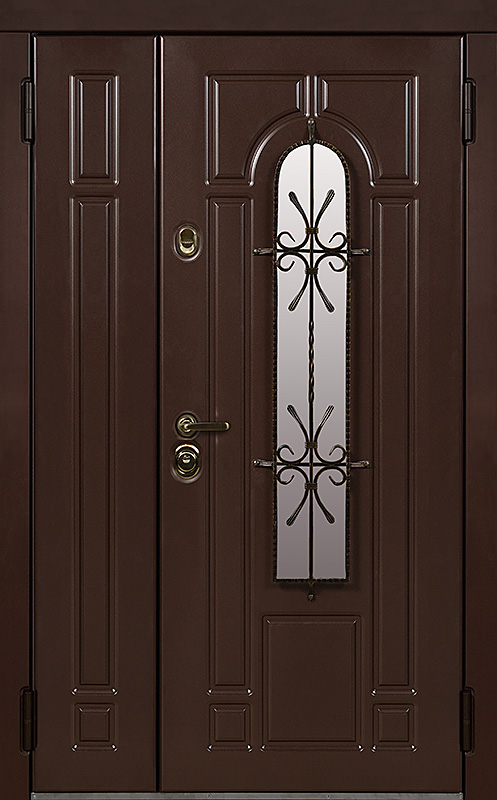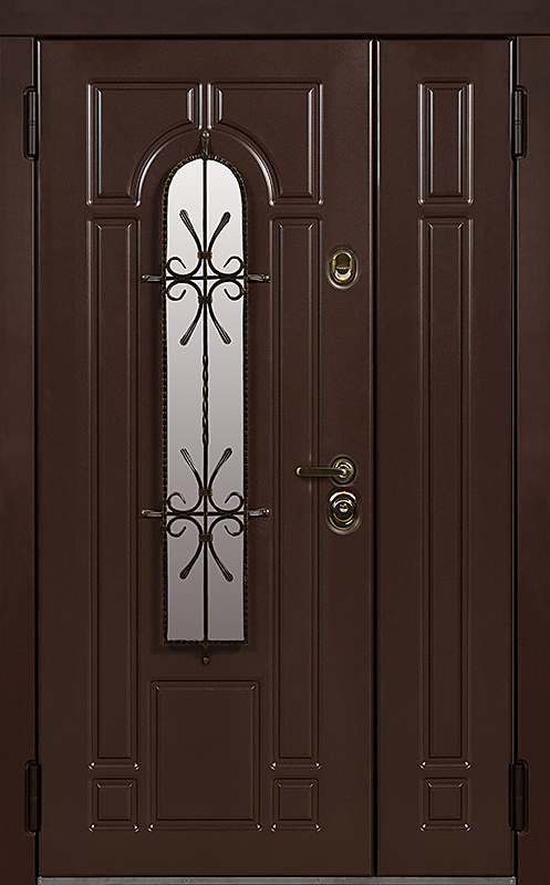 Эта металлическая двухстворчатая дверь с арочным стеклопакетом №15 представляет собой идеальный баланс между эстетикой и прочностью. Арочное стекло добавляет в её дизайн утончённость, а ковка в декоре придаёт изысканный, но в то же время крепкий и надёжный вид. Плита МДФ, используемая как для внешней, так и для внутренней отделки, не только сохраняет прекрасный внешний вид, но и устойчива к механическим повреждениям. Металлическая двухстворчатая дверь с арочным стеклопакетом №15 от производителя: быстрое изготовление и монтаж в Нахабино, индивидуальные размеры, широкий выбор материалов и фурнитуры, официальная гарантия до 10 лет.