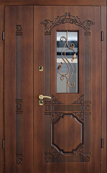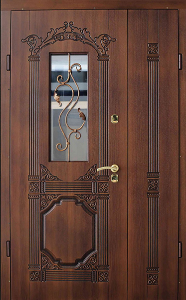 Уличная двухстворчатая дверь со стеклом и кованой решеткой №26 — это не только надежная защита для вашего дома, но и элемент, который подчеркнет его стиль и индивидуальность. Внешняя отделка из МДФ с ПВХ обеспечивает долговечность, устойчивость к внешним воздействиям и сохранение эстетического вида на долгое время. Добавление кованой решетки и стеклопакета придает двери элегантности, а также улучшает светопропускание, создавая комфортное освещение в вашем помещении. Уличная двухстворчатая дверь со стеклом и кованой решеткой №26 от производителя: быстрое изготовление и монтаж в Нахабино, индивидуальные размеры, широкий выбор материалов и фурнитуры, официальная гарантия до 10 лет.