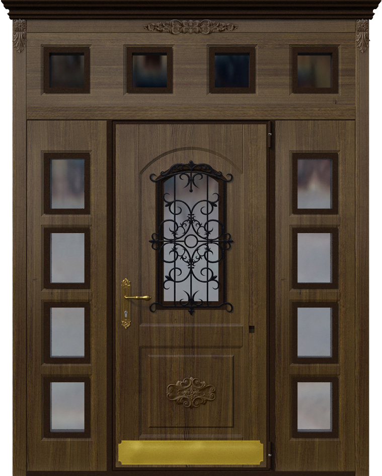 Эта модель выделяется своим масштабом и декоративностью: двухстворчатая дверь со вставками и ковкой №2 подчеркивает парадность входа и придает фасаду респектабельность. Основу составляет прочный каркас из стальных профильных труб с листом металла толщиной 2 мм и ребрами жесткости, что обеспечивает долговечность и защиту. Снаружи и внутри полотно облицовано накладками МДФ, которые позволяют воплотить различные варианты текстур и оттенков, сохраняя устойчивость к механическим повреждениям и влиянию внешней среды. Кованые элементы вносят в образ двери нотку изысканности и индивидуальности, делая ее центральным акцентом всего фасада. Для безопасности предусмотрены два замка турецкого производителя Kale Kilit — цилиндровый и сувальдный, каждый с ригелями, усиливающими защиту. Такая дверь сочетает надежность металлической конструкции с эстетикой классического дизайна, превращая вход в настоящий архитектурный акцент. Двухстворчатая дверь со вставками и ковкой №2 от производителя: быстрое изготовление и монтаж в Нахабино, индивидуальные размеры, широкий выбор материалов и фурнитуры, официальная гарантия до 10 лет.